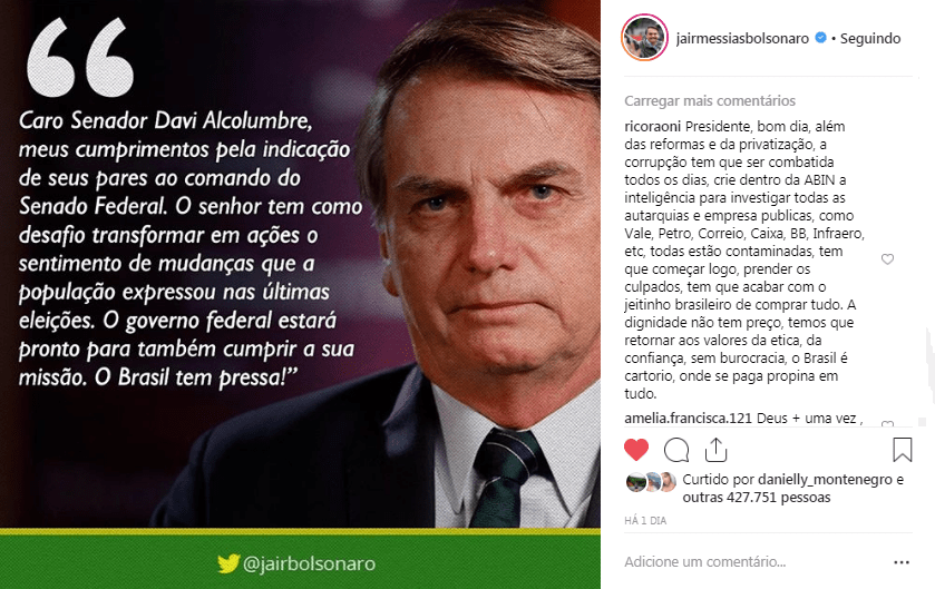 entre 77 válidos. Davi Alcolumbre (DEM-AP) como presidente do Senado Federal para o biênio 2019 – 2020. Foram mais de 15 horas de debates divididos em duas sessões para que os parlamentares definissem o comando da Casa Legislativa. Após o resultado da eleição, em breve discurso, Davi Alcolumbre agradeceu aos senadores que abriram mão das candidaturas e aos demais que concorreram ao cargo.